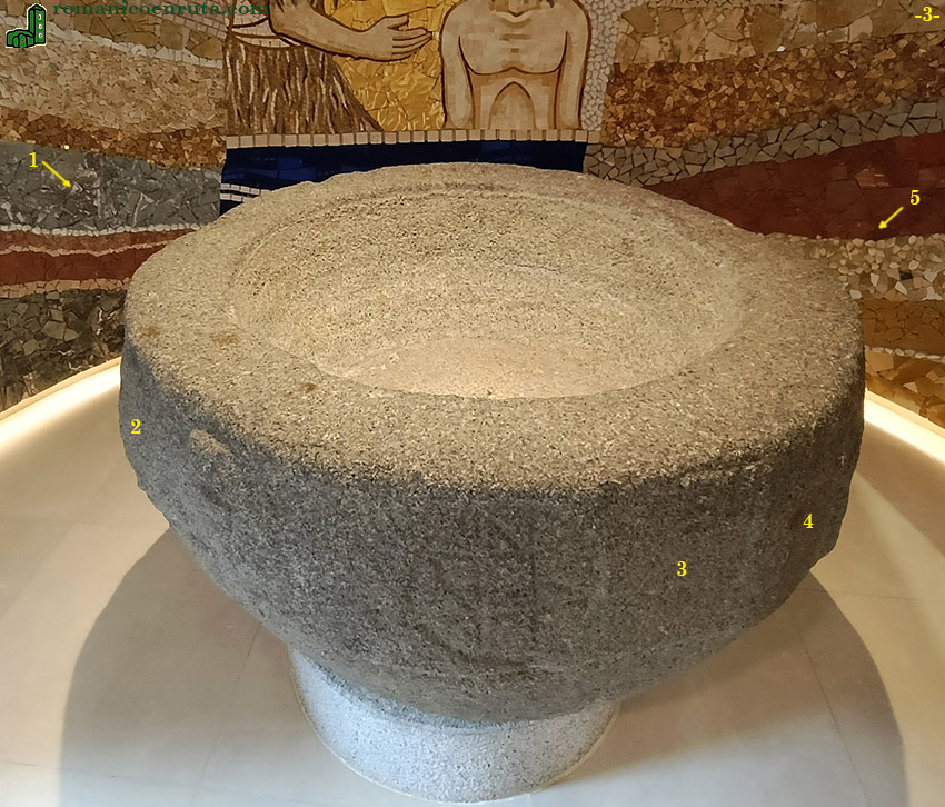 Con todo, el interior no deja de ser reseñable pues en él se exponen tres piezas románicas de gran mérito. En esta primera página nos centraremos en la pila bautismal, colocada en posición central del nuevo baptisterio, junto a la puerta de acceso abierta en el hastial de poniente (foto 2). La escena a su alrededor representa a San Juan bautizando a Jesús.