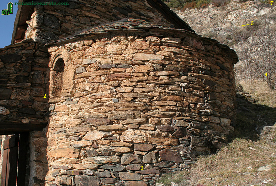 Se accede al templo por una breve escalinata pétrea que atraviesa un grueso muro que actua a modo de estribo en la esquina sureste del templo (foto 2). El ábside, salvo por una ventana abierta en su lado meridional, es completamente liso, sin arcos ciegos ni lesenas (fotos 2 a 5). Un breve sendero permite ascender hasta la zona más elevada por detrás del muro norte (foto 6).