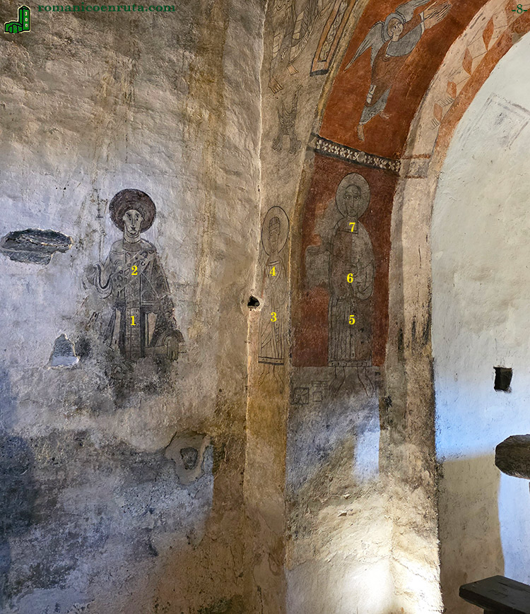En el lado de la epístola (foto 9, enlaces 1 a 7), frente a la escena que acabamos de describir, se sitúa otra todavía más enigmática en la que se nos presentan a dos personajes; un santo en primer plano y un ángel barbado detrás de él con una sola ala. De nuevo, quien la realizó no puede disimular su poca destreza y el personaje primero tiene tres pies mientras que los brazos se dibujan en posiciones poco naturales. ¿Quiénes pueden ser estas dos imágenes? Siguiendo a la autora antes mencionada, nos encontraríamos ante una representación de Juan Evangelista y el ángel que lo señala como el elegido para transmitir el mensaje de la divinidad.