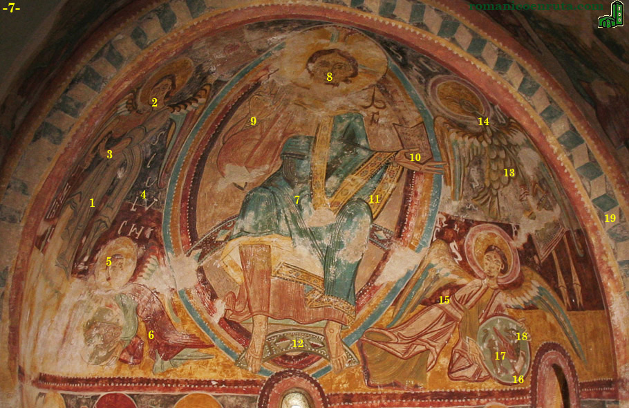 Os comentábamos en la página precedente que en la bóveda de cuarto de esfera se representaba a Cristo en el interior de la mandorla rodeada por el Tetramorfos; pero debemos hacer una puntualización: la figura de San Mateo, normalmente un ángel, se sustituye aquí por la del arcángel San Miguel (enlaces 1/2/3 y foto inferior), que alancea al dragón y viene identificado por los restos de la inscripción S MIH L. Debajo de él, un ángel sostiene un medallón con el símbolo de Lucas (enlaces 5/6). Todos los evangelistas llevan también inscripción.
