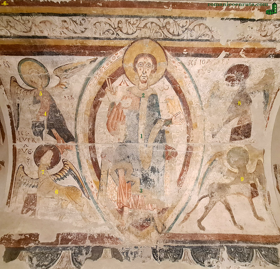 Empecemos pues con la Maiestas Domini rodeada de los cuatro símbolos de los evangelistas (foto inferior). Cristo, sentado y con nimbo crucífero, levanta su mano derecha mientras sostiene el Libro en su mano izquierda. Las letras alfa y omega aparecen sobre sus hombros. Una amplia cenefa vegetal (que aquí podéis ver sobre el rostro de Cristo) separa este ámbito del que ocupa el lado sur de la cubierta de la cabecera.