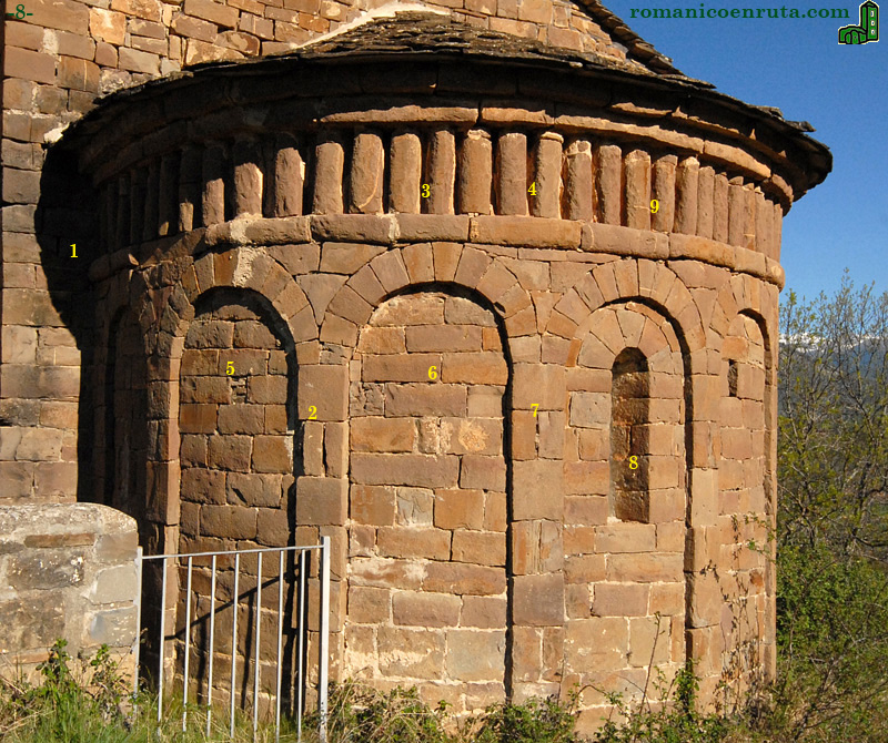 En la imagen superior, los enlaces de cada número nos permiten apreciar con más detalle el modo en que trabajaron los maestros canteros. Fijaos en que los salmeres de cada arcuación (enlaces 2 y 7) son individuales y que las lesenas alternan piedras individuales con otras dobles en posición vertical. La ventana aspillerada (enlace 8) presenta derrame tanto al interior como al exterior y ha sido cegada con alabastro.