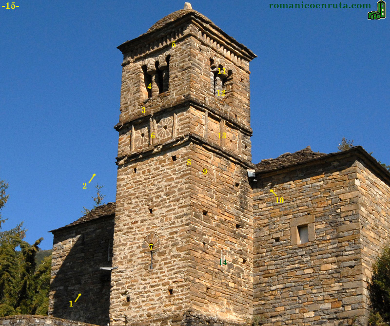 Empezaremos la descripción de la torre por su esquina sureste (foto 15). El cuerpo más destacado es el superior, que presenta mayor riqueza ornamental. Recordando la división entre mozarabistas y lombardistas, para algunos autores el campanario de San Bartolomé vendría a unir ambos estilos: el mozárabe en el cuerpo inferior y el remate de estilo lombardo en el cuerpo superior.