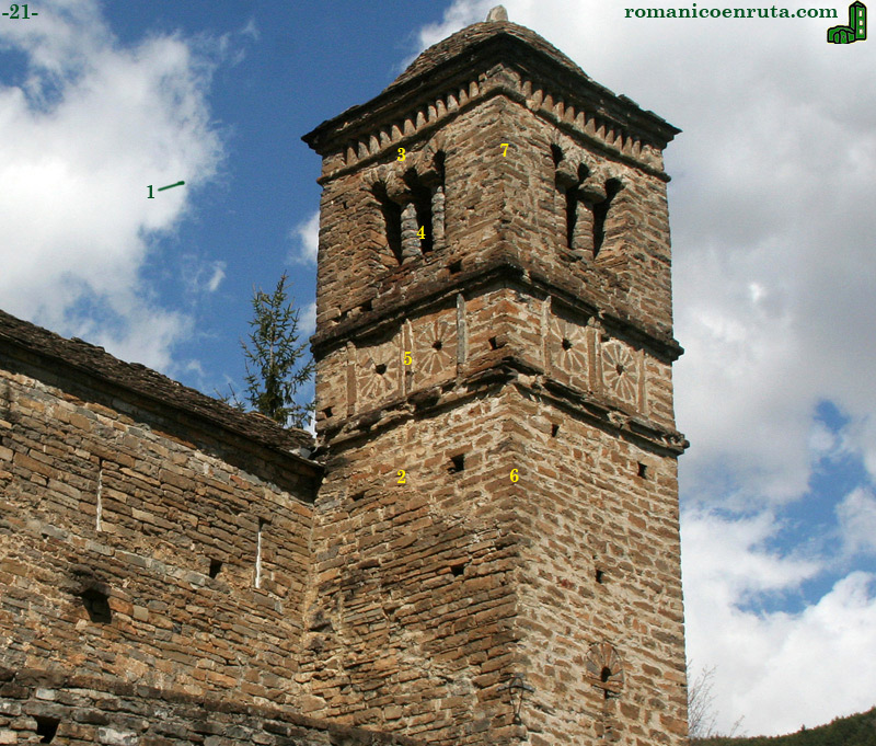 En la cara de poniente (foto 21), el cuerpo inferior carece de ventanas y el superior repite la ornamentación ya vista en las caras meridional y de levante: enmarcadas por molduras horizontales y verticales, dos rosetas (enlace 5) se colocan bajo la ventana de tres vanos separados por dos gruesas columnas (enlace 4). En el remate, bajo el alero de la cubierta, el friso de baquetones (enlaces 3/7).