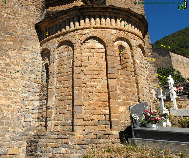 La iglesia se ubica en pleno casco urbano y el ábside queda rodeado por un pequeño y bien cuidado cementerio. No es el único templo en que se da esta última circunstancia, pero sí es en el que campo santo e iglesia conforman un espacio más recogido. En primer plano, fijaos en el alto basamento sobre el que se tuvo que elevar la cabecera. Los sillares no son isódomos, pero si están bien escuadrados y las hiladas mantienen la horizontalidad.