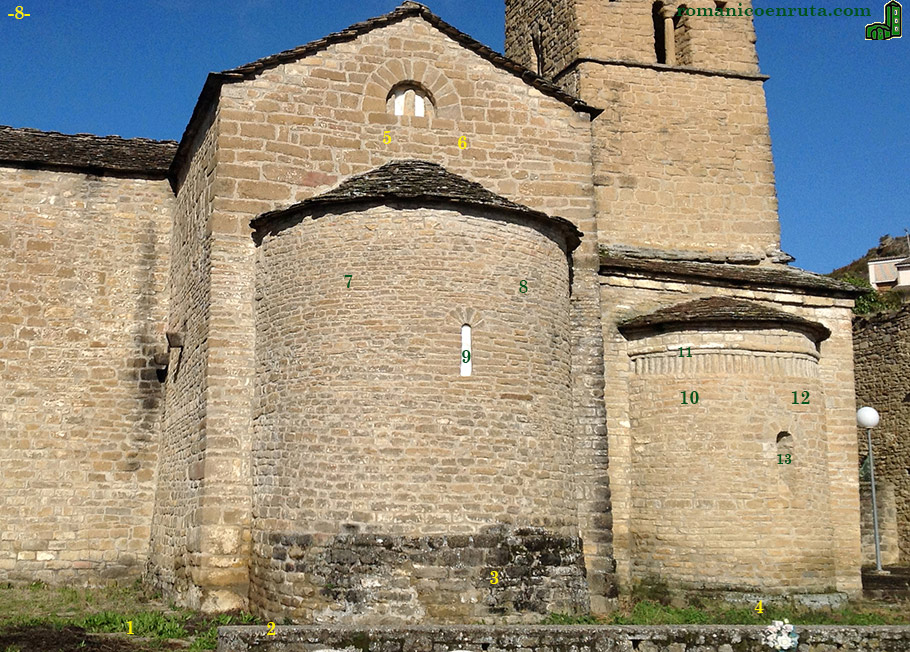 Los dos ábsides se construyeron, al parecer, en época coincidente, aunque existen algunas diferencias entre ellos. El central es liso y presenta ventana aspillerada a media altura rematada por arco de medio punto con seis dovelas. Solo lleva derrame al exterior del muro. El ábside septentrional, de menor tamaño, se decora con el típico friso de baquetones visto en muchas de las iglesias de la ruta 1 de Huesca (enlaces 12/13) y su ventana es de doble derrame (enlace 13). La cubierta repite el modelo visto en el ábside central. |