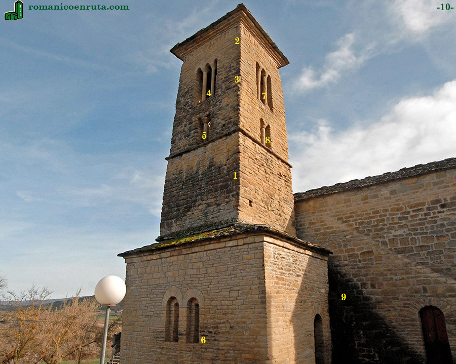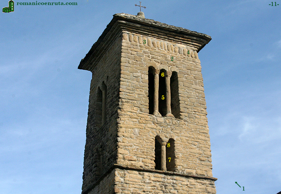 Los dos cuerpos de la torre se separan por medio de imposta que corre a la altura de la base del primer nivel de ventanas (enlace 1 foto superior). Los maestros canteros que erigieron el templo no parece que demostraran gran pericia pues prestan poca atención al detalle, circunstancia que viene reflejada en la escasa ornamentación de los muros y capiteles de las columnas que dividen los vanos (enlaces 6/8), cuyas cestas son completamente lisas.