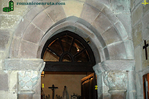 El acceso a la cabecera se realiza a través de un arco triunfal de doble rosca ligeramente apuntado (foto 4). La rosca interior descansa sobre semicolumnas con capiteles esculpidos. El capitel izquierdo lleva representado en la parte central de su cesta un Pantocrátor (enlace 2) que bendice con su mano derecha en alto y sostiene un gran libro herrado en su mano izquierda. Los cuatro símbolos de los evangelistas sostienen la mandorla. En los laterales de la cesta, los doce apóstoles, seis a cada lado (enlace 1), acompañan la escena.