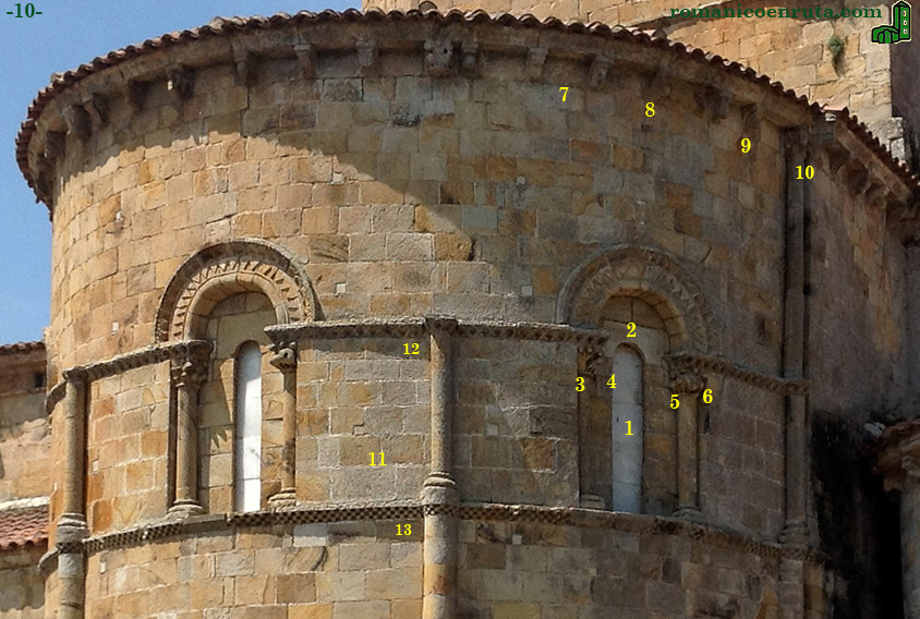 Los canecillos de la última calle son: bola con caperuza (a la derecha del capitel que separa las calles); ménsula con volutas laterales y caveto con punta central (enlace 7); triple caveto con disco central (enlace 8); cabeza de cabra; bola con caperuza en triple caveto (enlace 9) y capitel de la última columna decorado con bolas con caperuza y volutas (enlace 10).