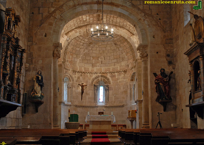 A diferencia de la nave, tanto el presbiterio como el ábside se cubren con piedra de sillería. El primero con bóveda de medio cañón, y el segundo con bóveda de cuarto de esfera. La ornamentación del interior del templo se circunscribe a su cabecera y os la detallamos en las siguientes páginas.
