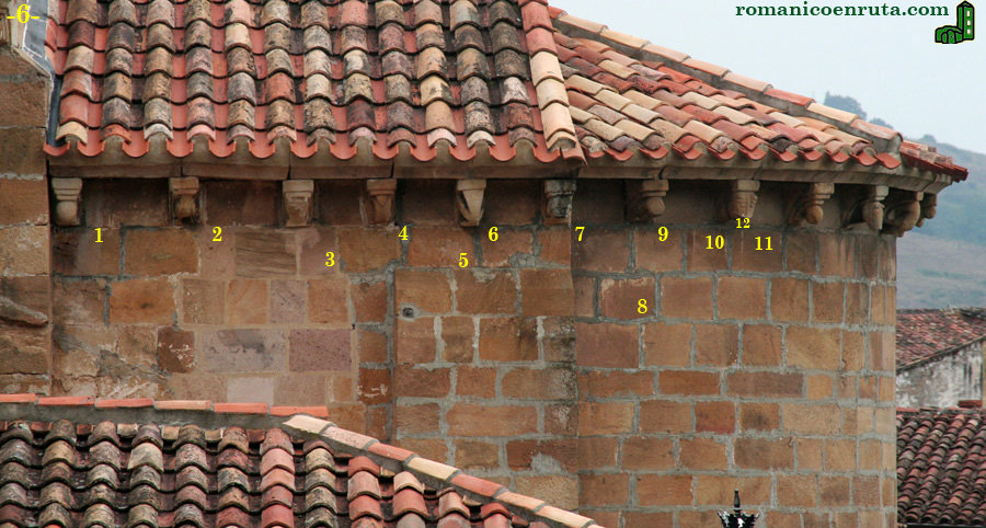 La cornisa del tramo presbiterial lleva seis canes en cada lado, y el semicírculo del ábside los trece restantes, para un total de veinticinco canecillos. Empezando por los del presbiterio sur observamos los siguientes motivos (foto 6): bola con caperuza sobre cavetos superpuestos (enlace 1); ave de rapiña (enlace 2); cabeza de animal de la que solo se intuyen los pequeños cuernos (enlace 3); voluta con caperuza (enlaces 4/5); cruz griega (enlaces 5/6) y cabeza de animal, quizás un felino (enlace 7).