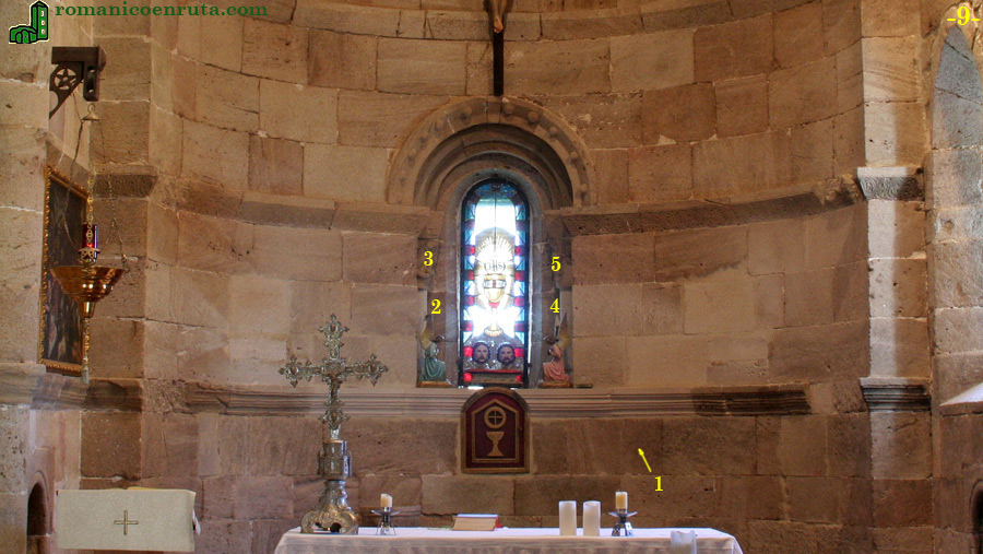 Si exteriormente la ventana central de la calle central del ábside lleva dos arquivoltas y columnas con sus correspondientes capiteles, lo mismo podemos decir de su lado interior. Aquí, la chambrana se decora con bolas y la arquivolta interior con un grueso baquetón (enlace 1). Los capiteles también son figurados y recogen dos temas también muy frecuentes en el románico de toda la península: dos aves afrontadas el de la izquierda (enlace 2) y Eva y la serpiente el de la derecha (enlace 3). En este caso, Eva se encuentra sentada y recoge con su mano derecha la manzana que la serpiente, enroscada en el árbol, parece llevar en la boca.