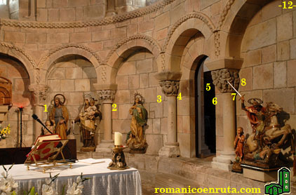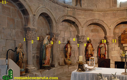 Capitel 1 (foto 11, enlaces 1/2/3): cimacio biselado con rosas de ocho pétalos y en la cesta seis figuras de pie, muchas rotas. Por su ejecución se parece al capitel izquierdo de la ventana exterior izquierda del ábside.