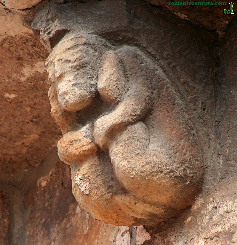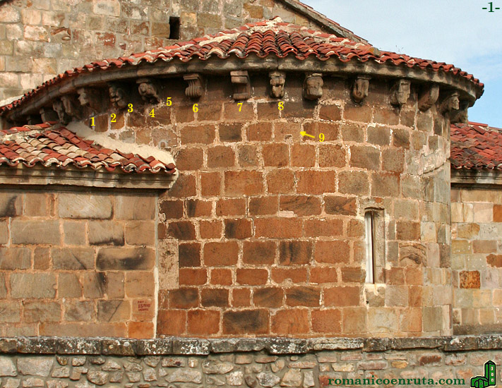 Ya en el tramo semicircular del ábside, comprobaremos que algunos de los canecillos repiten la iconografía de los canes ya vistos en la cornisa del muro sur y en el alero de la portada.