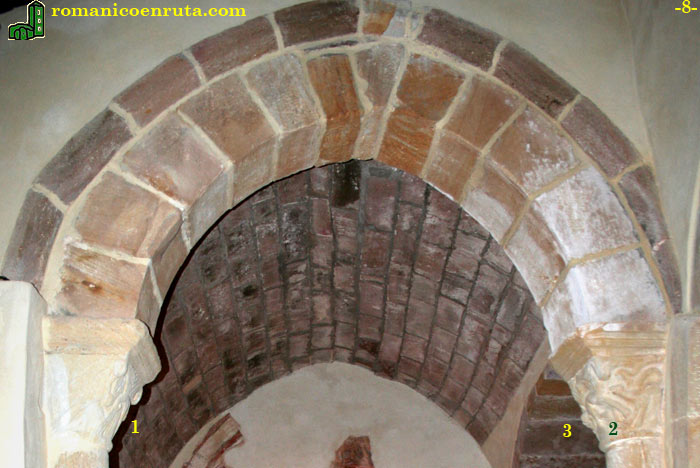 En el segundo tramo de la nave del evangelio, las columnas del arco formero también llevan capiteles románicos decorados. En la foto 11 podéis ver uno de ellos, que se decora con dos filas de volutas. El del otro lado de ese mismo arco (lo podéis ver en la página anterior, foto 7, a media altura a la derecha) apenas lleva decoración: algunos trazos levemente incisos.