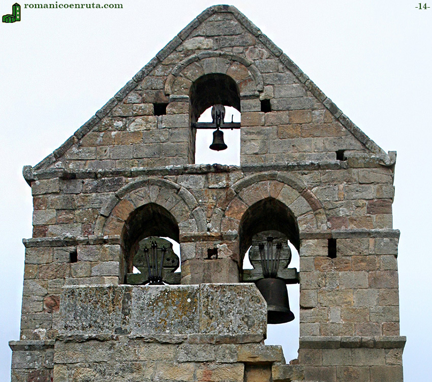 La espadaña exenta se coloca al este del templo, sobre un terreno un poco más elevado. Responde, según García Guinea, al tipo "a" de espadaña, es decir, recta con los distintos cuerpos de la misma anchura.