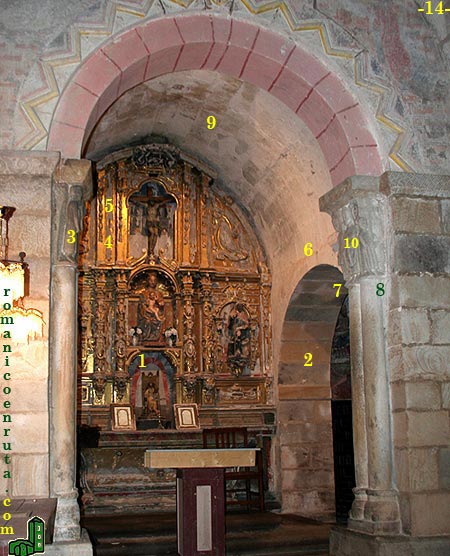 Ya hemos dicho que la zona más antigua del templo es la de la nave norte, rematada al este (foto 13) por un ábside rectangular que se cubre con bóveda de medio cañón. La transición entre ábside y nave se realiza por medio de un arco triunfal de medio punto y doblado (foto 14) que apoya sobre columnas entregas (enlaces 1/2) de doble fuste con capiteles iconográficos. El extradós que mira hacia la nave se decora (enlace 9) con amplios dientes de lobo.