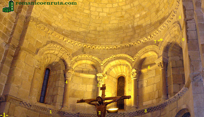La arquería alta (foto 1) se compone de cinco arcos de medio punto que apoyan sobre seis capiteles. Queda separada del cuerpo inferior por una imposta abilletada mientras que otra de palmetas marca la transición entre este segundo cuerpo del ábside y la bóveda de cascarón que lo cubre. De los cinco arcos, tres llevan ventana aspillerada y los otros dos son ciegos.