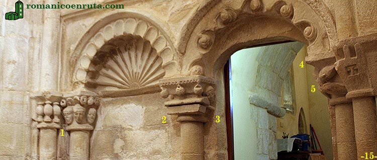 Siguiendo el modelo de la arquería inferior del tramo semicircular, los motivos esculpidos en los capiteles del arco ciego y las credencias (foto 15, enlaces 1 a 5) formarían una única escena: las Tres Marías ante el sepulcro.