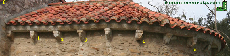 Ya os hemos comentado que los únicos canecillos esculpidos los encontraremos aquí, bajo la cornisa. En total suman 16, de los que os mostramos fotos ampliadas en algunos casos. El hecho es que muchos de ellos no están en perfecto estado de conservación y su interpretación dista mucho de ser precisa.