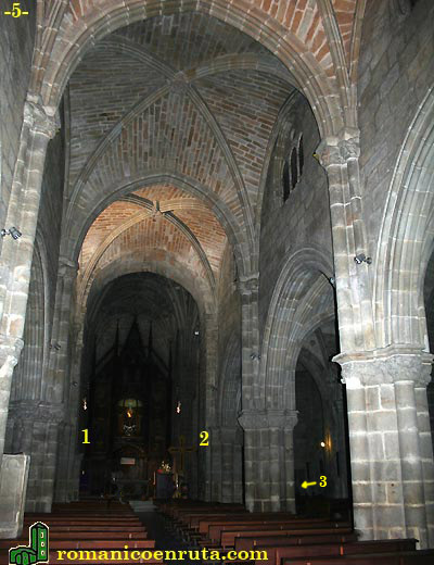 El hecho es que al emprenderse las obras del primer tramo de la nave o naves de este supuesto edificio románico, las nuevas tendencias góticas, que poco a poco iban ganando terreno, alteraron la idea inicial y se optó por elevar la altura de las naves y cubrirlas con bóvedas de crucería. En todo caso, el arco que daba paso desde la nave central a la cabecera (foto 5) ya estaba construido y seguía los cánones del quehacer románico: arco de medio punto con grandes capiteles figurados que descansan sobre sendas columnas entregas.