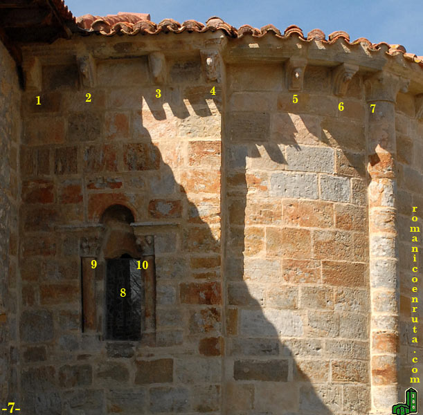 Cuatro canecillos sostienen la cornisa del tramo sur del presbiterio (foto 7). El de la izquierda (enlace 1) presenta cuatro cavetos superpuestos en degradación; su vecino de la derecha (enlace 2) muestra sobre un caveto liso una pequeña cabeza de animal; el siguiente (enlace 3) lleva un prótomo de animal, quizá un cérvido; y el del extremo derecho, aunque muy erosionado, lo ocupa un hombre itifálico que se lleva la mano derecha a la barbilla (enlace 4). En el paño sur del tramo semicircular, el primer can consiste en tres cavetos superpuestos con una pequeña bola (enlace 5); a este sigue otro muy similar en que en lugar de una bola se observa una cabecilla humana (enlace 6). El capitel de la semicolumna llena la cesta con grandes hojas lisas verticales terminadas en pequeñas bolas (enlace 7)..