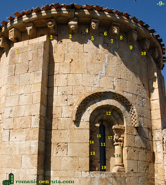 La calle central (foto 9) es la más interesante del semicírculo absidal y la más completa pues conserva la ventana axial. Antes, sin embargo, de detenernos en esta última, continuemos con los canes que soportan la cornisa. Por encima del estribo que separa los paños se colocó un can decorado con una cabeza de carnero. Ya en la calle central, el siguiente canecillo luce un animal que vuelve su rugiente rostro hacia el observador (enlace 2); el de la derecha (enlace 3) lo ocupa un tonel; a este siguen cuatro canes con sendas cabezas de animal de difícil identificación (enlaces 4 a 10) pero que parecen incluir dos perros o lobos (enlaces 4 a 8) y quizá un oso (enlace 9).