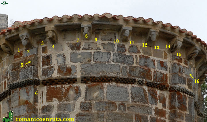 Por encima del estribo que separa la calle meridional del ábside de la central, se colocó un can con la cabeza de un ciervo de abundante cornamenta (enlaces 1/2) al que sigue, ya en el paño central, un exhibicionista masculino que se lleva la mano derecha al mentón y se ase el sexo con la izquierda (enlaces 3/4). El siguiente muestra un rostro femenino que quizá se trate de una arpía (enlaces 7 a 9) y su vecino parece ocuparlo, a pesar del desgaste, otro personaje itifálico (enlaces 10/11).