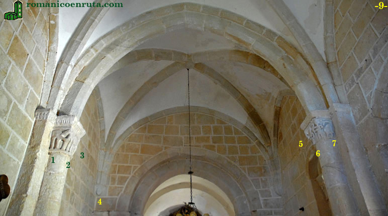 En la foto inferior observamos la cubierta del tramo de la nave vecino al presbiterio. En primer plano los capiteles de las semicolumnas en que apeaba el arco fajón doblado de la primitiva bóveda de cañón, sustituida por la actual de crucería ya en época gótica. La cesta del capitel septentrional se decora con dos pares de cuadrúpedos afrontados (enlaces 1 a 3) que parecen luchar entre sí pues uno de ellos muerde las piernas delanteras a su oponente mientras éste le ase fuertemente del cuello con la boca.