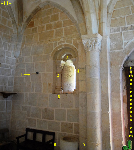 De las dos ventanas que se abren en el muro meridional, solo la más cercana al presbiterio es románica (foto 11). Presenta una abertura de saetera de derrame interior con doble arco de medio punto (enlace 1); el arco externo se decora con dientes de sierra y bocel sogueado y el interno con dientes de sierra (enlace 3). Éste último descansa sobre dos columnas acodilladas de fuste liso; la de la izquierda decora su capitel con dos cabezas, una de hombre y otra de mujer, y en la esquina, una bola dentro de un objeto cóncavo (enlace 2); el capitel de la columna derecha muestra un gimnasta con las piernas abiertas y en alto (enlace 4). Bajo la ventana se halla una pequeña pila de agua bendita de la que no tenemos constancia de su origen (enlaces 6/7).