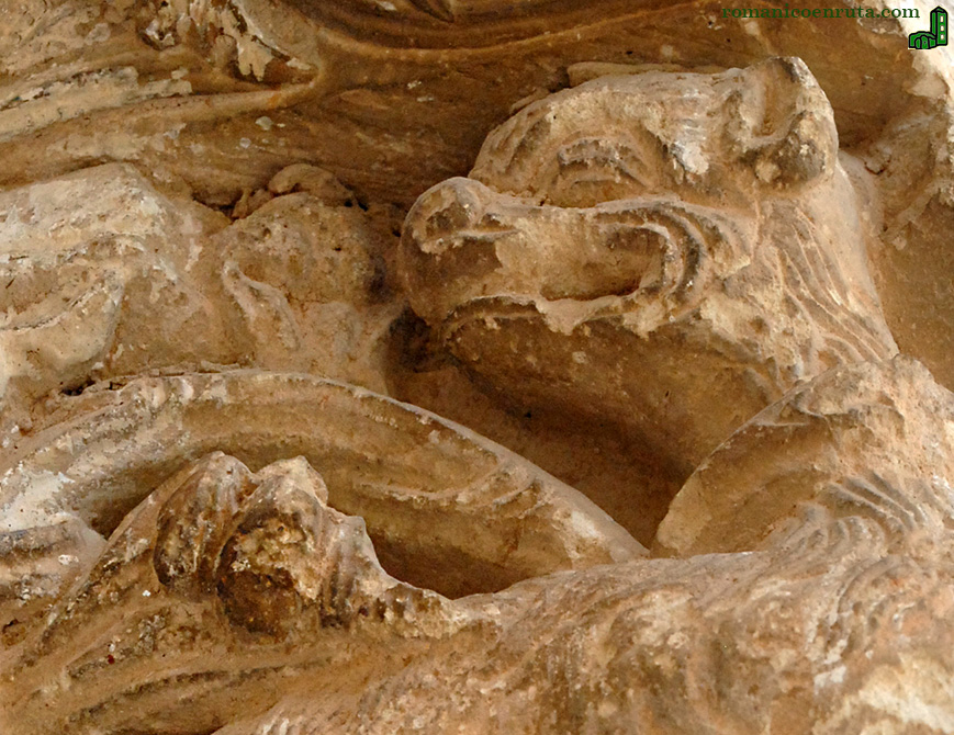 En la foto inferior os ofrecemos una vista general del muro meridional en el que se conserva toda la obra escultórica románica del templo: los capiteles de la arquería ciega, la portada y una de las dos ventanas, puesto que la más próxima a la cabecera ha sido cegada por la construcción a la derecha de la foto. Tanto los arcos ciegos como el de la ventana superior (enlace 3) son de medio punto y descansan sobre capiteles esculpidos: los de la ventana con grandes hojas verticales (enlace 5) y los de la arquería con motivos vegetales y figuras humanas. Los tímpanos de los tres arcos se decoran con tres pequeños arquillos ciegos. El capitel central (enlaces 6 a 8) lleva una gran hoja vertical a cuyos lados se disponen dos luchas entre caballero y dragón. Las figuras están muy desgastadas, pero el dragón de la izquierda conserva una de sus grandes alas y el caballero parece atacarlo con una lanza. Las figuras de la derecha (enlace 8) son casi irreconocibles.