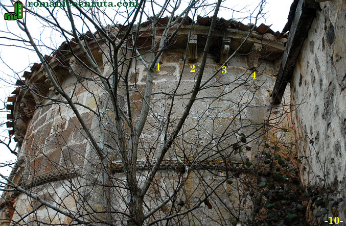 El último lado visible de la cabecera es una parte de la calle norte, que junto con el tramo presbiterial se vio afectado por la construcción de la sacristía (foto 10). En este paño se conservan cuatro canecillos que, a diferencia de los que hemos visto anteriormente, no presentan decoración figurativa.