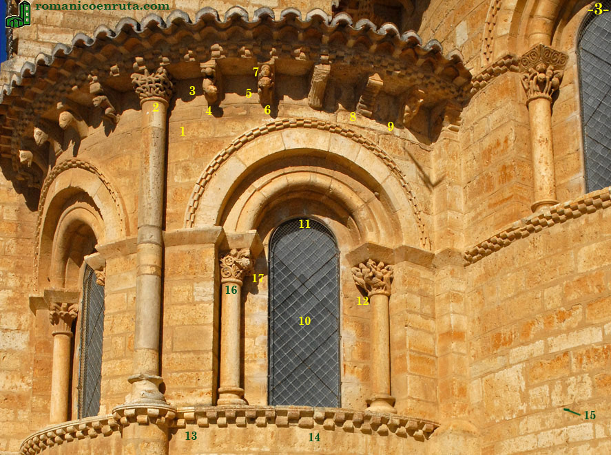 En el lado este de la cornisa (enlace 1), junto al capitel de la semicolumna (enlace 2), los canes sobre los que apoya aquella son los que siguen: un león acostado con una bola entre sus patas delanteras (enlaces 3/4); una representación de Sansón desquijarando al león (enlaces 5 a 7); un can vegetal muy deteriorado al que sigue otro con ocho rollos horizontales superpuestos (enlace 8); y en el extremo derecho una cabeza humana (enlace 9).