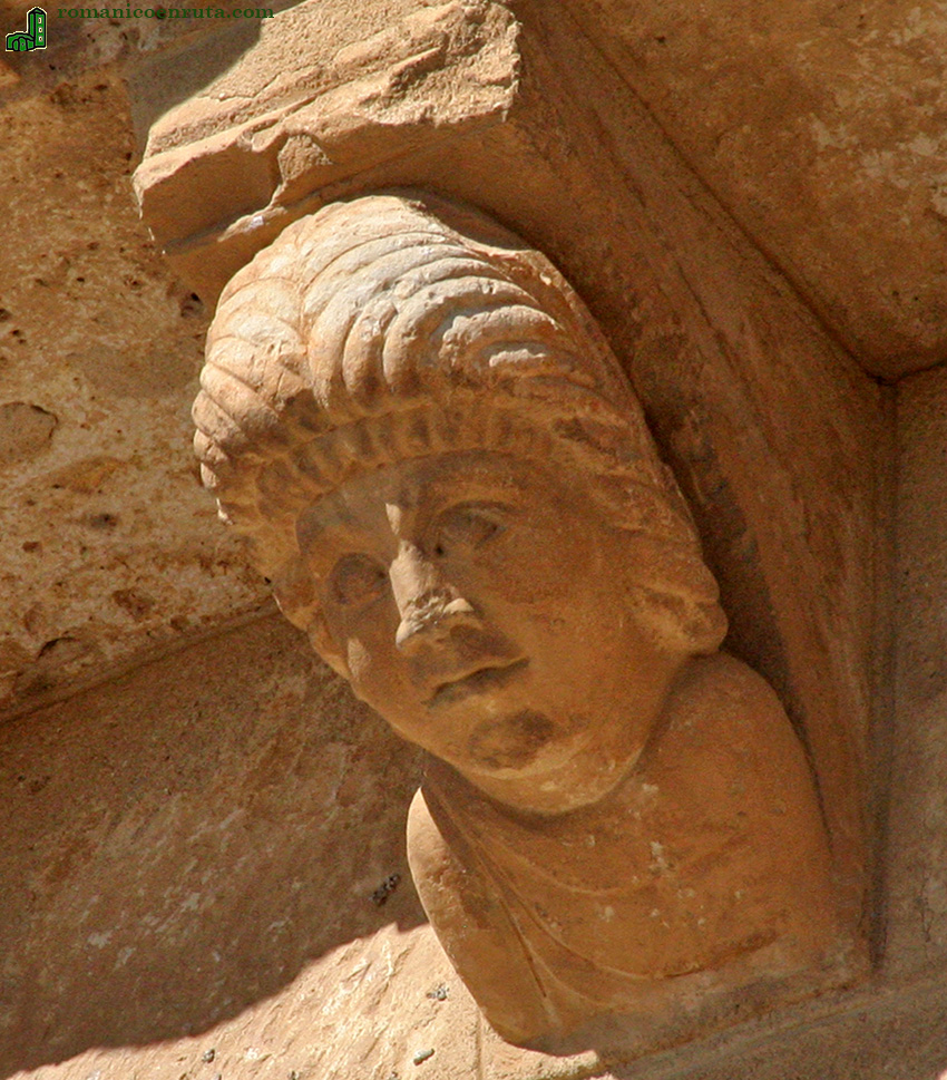 La ventana central (enlaces 22/23) es como todas las de la cabecera y sus capiteles son de excelente factura. El de la izquierda (enlace 24) presenta en la parte inferior de la cesta roleos con palmetas inscritas; sobre estos se tallan grandes hojas de acanto verticales y caulículos en las esquinas superiores. El de la derecha (enlaces 25 a 27) nos muestra a dos personajes que parecen abrazarse y que han sido interpretados como el recibimiento de un alma en la mansión celestial.
