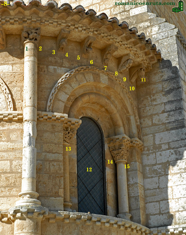 Los capiteles de la ventana no presentan figuras humanas, pero la ejecución de sus motivos vegetales muestra gran pericia: en el de la izquierda observamos dos filas de roleos con palmetas inscritas (enlace 13) y en el de la derecha (enlaces 14/15) palmetas inscritas en sus propios tallos. Tanto el de la izquierda como el de la derecha llevan caulículos en las esquinas de la cesta.
