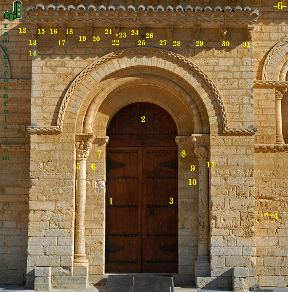 En nuestra descripción de las portadas empezaremos, pues, por la portada septentrional (foto 6), la menos "retocada" por el proyecto restaurador de Aníbal Álvarez.