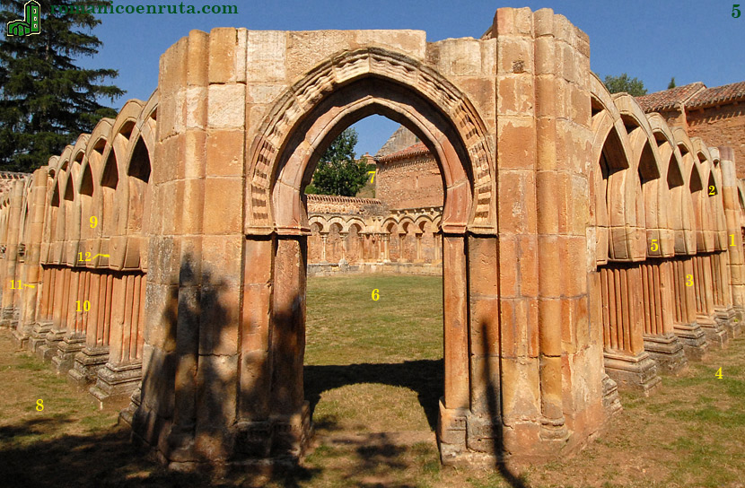 Observaréis que la decoración desaparece casi por completo pues no hay capiteles y no queda ninguno de los canes del alero. Cuatro robustos arcos entrecruzados, flanqueados por medios arcos en los extremos, se disponen a ambos lados de la puerta. Todos descansan sobre pilares con fustes estriados y plintos individuales que arrancan directamente del suelo. |