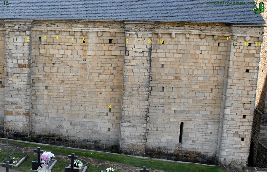 En los dos últimos tramos de esta fachada septentrional (foto 12) la única abertura, en forma de aspillera, la encontramos en el tramo de poniente. Algunos de los sillares presentan decoración con motivos geométricos (enlace 8). Los canes repiten los motivos ya observados en los tramos anteriores: rollos horizontales y verticales y cabezas humanas o máscaras (enlaces 1 a 14).