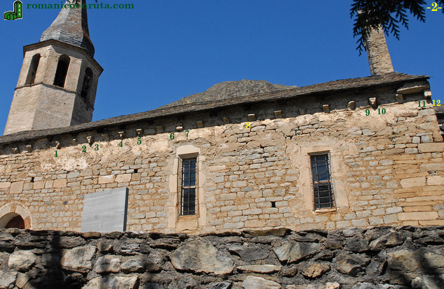 Nos quedan por detallar los 18 canecillos del lado oriental. Aquí, muchos carecen de decoración y son cavetos simples completamente lisos. Los ocho restantes con figuras o algún elemento decorativo esculpido son los siguientes: el número 13 (enlace 1) lleva dos billetes; el quince (enlaces 2/3) una cabeza de cabra; el diecisiete una cabeza humana (enlace 4); y a este le sigue otro con una punta de diamante (enlace 5). El veinte lleva un bidón (enlaces 6/7)...