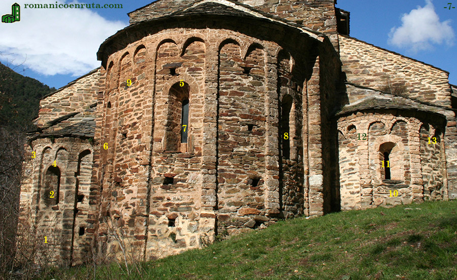 La absidiola sureste (foto 7, enlace 1) presenta una ventana central de doble derrame (enlace 2) y tres grupos de arcuaciones dobles entre lesenas (enlaces 3/4) que confluyen en ménsulas triangulares. Los arcos de las ventanas de los ábsides laterales son tangentes a las ménsulas de los arquillos centrales.