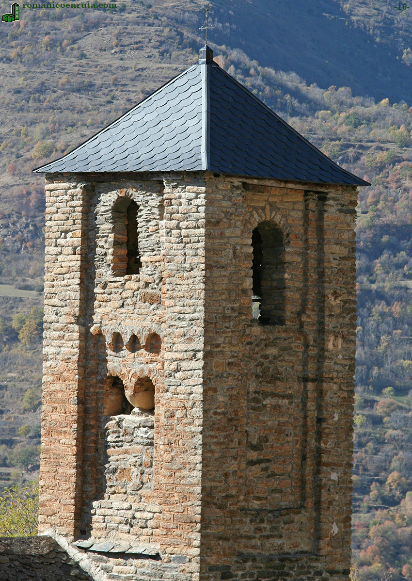La decoración es de tipo lombardo, similar a la del ábside. Frisos de arcos ciegos, de los que solo permanece el de la cara este, separaban los dos pisos.