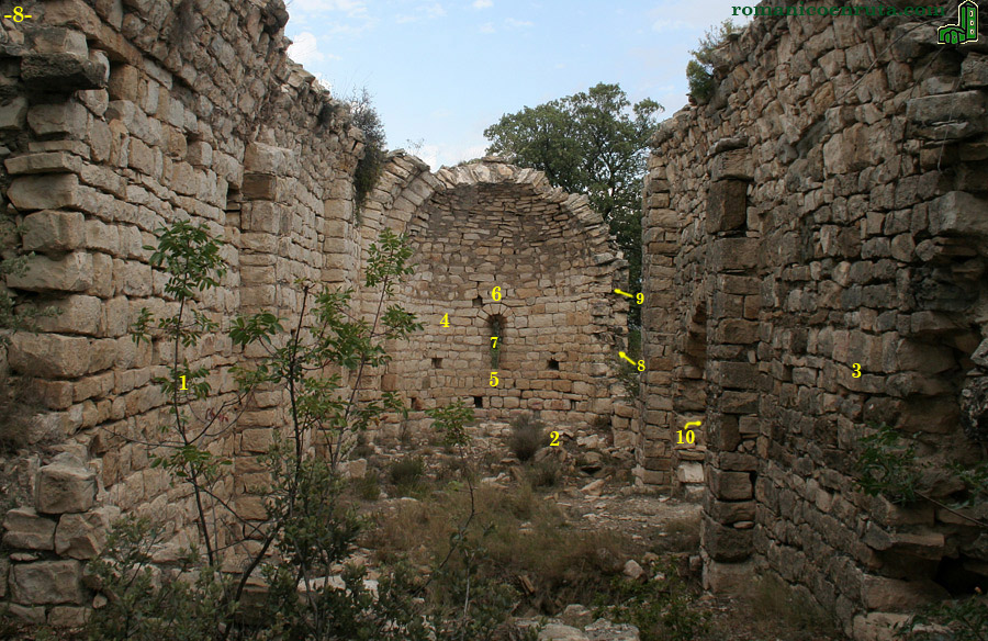 En el texto introductorio os hemos adelantado que la cubierta de Sant Feliu era de medio cañón reforzada por dos arcos torales. En la foto inferior podemos observar las pilastras sobre las que apeaban los arcos, que todavía se conservan tanto en el muro norte como en el de mediodía (enlaces 2/3). El ábside se cubría con bóveda de cuarto de esfera de la que queda la mayor parte (enlaces 5 a 9).