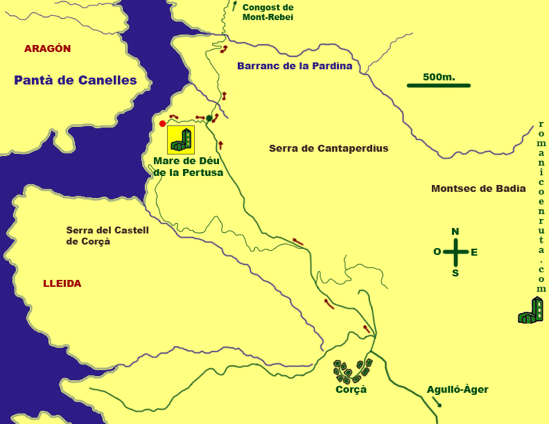 La ermita o capilla de la Mare de Déu de la Pertusa debe ser visitada a pie. Podemos llegar en coche hasta el pequeño pueblo de Corçà, donde conviene dejar el vehículo, o bien seguir por un camino sin asfaltar que nos conducirá hasta el inicio del sendero que conduce al Congost de Mont-Rebei (señalado en el mapa con un punto verde). Aquí hay espacio suficiente para aparcar algunos coches pero el trayecto entre Corçà y este punto es casi completamente llano con lo que el paseo vale la pena. El sendero que lleva a la ermita sale también del lugar donde habremos aparcado nuestro vehículo si es esa la opción elegida. Al principio emprende un pronunciado descenso para, poco después, girar hacia la izquierda y ascender hasta la capilla por terreno muy rocoso y de fuertes pendientes. A pesar de lo escarpado del lugar, no creemos que las personas con vértigo tengan dificultad alguna en llegar hasta la Pertusa. Una vez allí, cada uno decide hasta dónde atreverse a la hora de asomarse a los acantilados que caen a plomo sobre el Pantà de Canelles. |