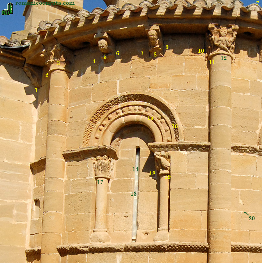 La calle sur (foto 7) queda enmarcada por dos semicolumnas rematadas por capiteles esculpidos. A la izquierda de la primera semicolumna es todavía visible, aunque muy deteriorado, uno de los canes del tramo presbiterial (enlace 1) que debió de decorarse con el busto de algún personaje pues se distinguen aún los pliegues de las ropas que descansan sobre los hombros. El capitel de la semicolumna (enlaces 2 y 3) se decora con dos filas de hojas acanaladas y piñas en las esquinas superiores. Los dos canecillos que vienen a continuación llevan sendos bustos (enlaces 4 a 9) que parecen sostener un libro en las manos.