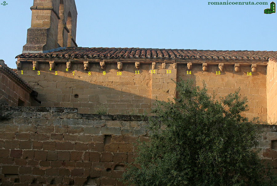 Vistos ya los canes que sostienen el tejaroz del ábside, los que nos quedan por describir son los que sostienen el alero del tejado de la nave, tanto en su fachada meridional (la de la foto inferior) como en la fachada septentrional (foto 2). Como podéis observar en la imagen, los canecillos de la fachada sur han sido sustituidos en su mayor parte por otros modernos que se decoran todos con el mismo motivo: una bola sobre caveto simple, que ampliamos en el enlace 16 de la foto 2.