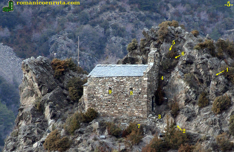 La ermita de Sant Martí de Nagol es una pequeña construcción de una sola nave con cubierta a dos aguas y ábside semicircular (foto 5) que se encuentra en la cima de un promontorio (foto 4) que pende casi verticalmente sobre la población de Sant Julià de Lòria (foto 3). Su acceso no es complicado pero deberemos andar durante media hora para llegar allí. El sendero (fotos 1/2) está bien indicado y sale a nuestra izquierda en la carretera que sube hasta Sant Serni de Nagol, en la curva anterior a la situada junto al templo.