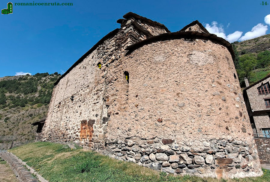 Pocas ventanas se abren en los muros para iluminar el interior. Aparte de la ventana absidal, en la fachada sur (foto superior) se abren las otras dos cuyas aberturas son dos sencillas aspilleras coronadas por arcos de medio punto, el de la ventana de la nave meridional compuesto por dovelas de piedra toba (enlaces 1/2).