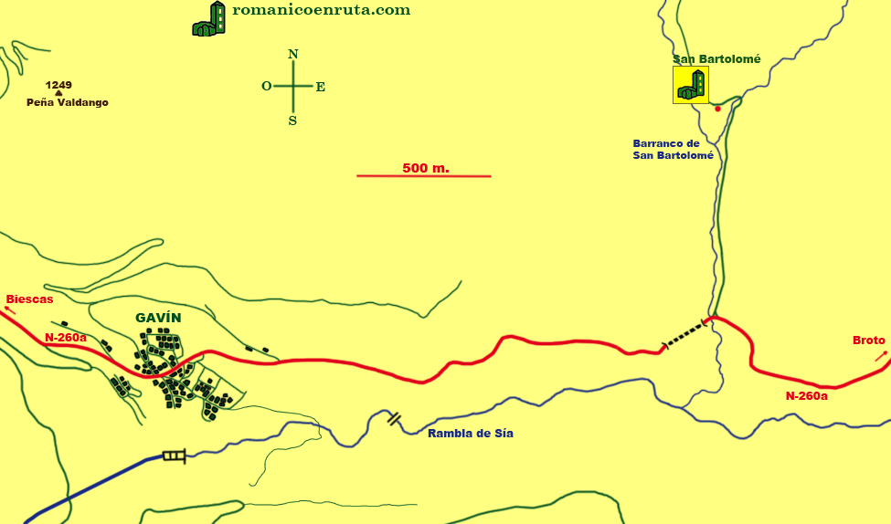 El acceso a la iglesia de San Bartolomé de Gavín no tiene pérdida. Una vez hayamos atravesado el núcleo urbano de la población, deberemos seguir apenas unos dos quilómetros en sentido al Puerto de Cotefablo por la N-260a. El desvío que nos conduce hasta ella aparecerá a nuestra izquierda nada más dejar atrás el primer túnel que nos saldrá a camino. Otro quilómetro de ascensión por una carretera asfaltada pero más estrecha nos dejará junto a la iglesia. Podéis estacionar en el punto más alto, junto a la fachada norte. No hay mucho espacio pero sí el suficiente para la poca afluencia de visitantes. |