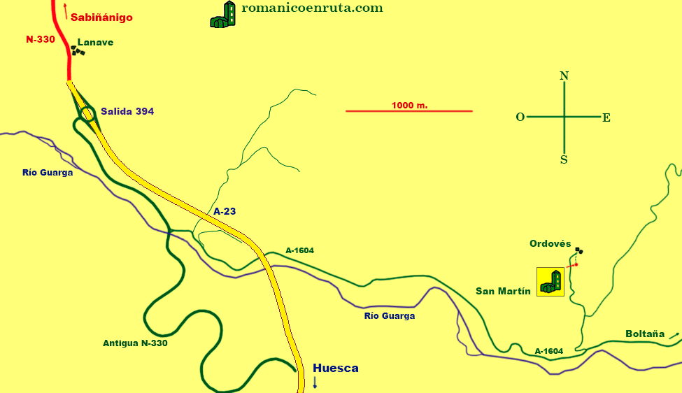 Para acceder a la iglesia de San Martín de Ordovés tendréis que tomar la salida 394 de la A-23 (Autovía Mudéjar) para conectar con la A-1604 que, atravesando el valle del Serrablo, nos conduce hasta Boltaña. Si venís de Huesca, la autovía ya está en funcionamiento, pero si vuestro punto de partida es Sabiñánigo, la autovía todavía se encuentra en obras y accederéis a la A-1604 desde la N-330, justo en el punto en que empieza el tramo habilitado de la autovía. Os tenéis que dirigir hacia el este, hacia el interior del valle. A unos tres quilómetros del cruce en que empieza la comarcal, os sale a vuestra izquierda, en una curva algo escondida, una carretera en ligera ascensión que conduce hasta Ordovés y Abenilla. San Martín se encuentra al sur del breve núcleo urbano de Ordovés, sobre un cerro con amplias vistas sobre el valle que recorre el río Guarga. Podéis aparcar el vehículo junto a la carretera y andar los últimos metros hasta el templo. |
