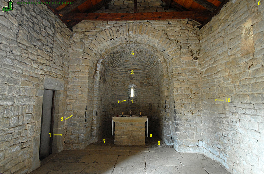 Ya podéis observar que el sillarejo utilizado en el interior también es de tamaño muy dispar aunque se procura mantener la horizontalidad de las hiladas. La zona del breve presbiterio se cubre con bóveda de medio cañón un poco rebajado y el semicírculo con bóveda de horno o cuarto de esfera (enlaces 3/6). La ventana axial presenta derrame escalonado solo en el interior (enlaces 4/5). Para construir el arco con que se remata se utilizaron dovelas de piedra toba, como la utilizada en el friso de baquetones.
